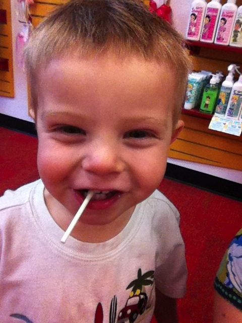 She sits again. He is squirming. Legs akimbo. He squawks. His eyes flash. He watches in the mirror. He squawks again. She hands him a lollipop. He moves as the clippers come close to his ears. He is DONE. She is not. The lollipop is launched across the room. Now she is done. He grins.